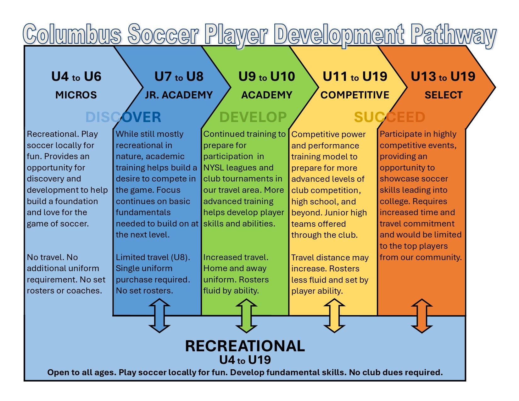Our Academy program builds on the foundation of our Junior Academy program and is the next step in the Columbus Soccer Club player development pathway. At the Academy stage of development we introduce the concept of teammates and a general team structure. We continue to fine-tune individual skills and technique but expand the learning environment to include the use of other team members and space. This additional focus allows players to build trust with one another and their training to be successful on the pitch. Overall, our focus continues at the Academy level is on individual player development and not wins and losses.