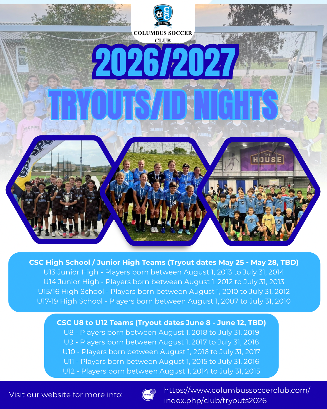 The Columbus Soccer Club will be hosting tryouts and ID nights for all soccer players interested in joining our club soccer program for the upcoming 2026-2027 competitive season.